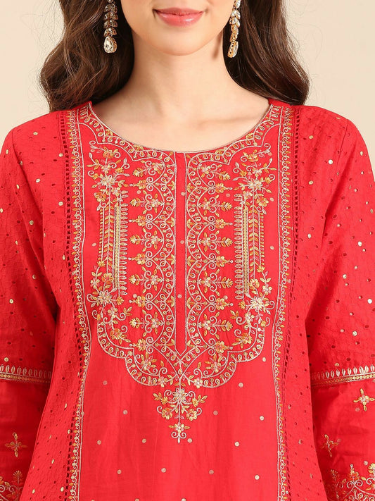 Red Floral Embroidered Straight Kurta with Palazzos and Dupatta