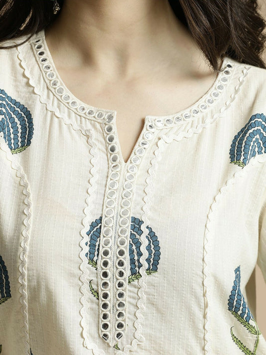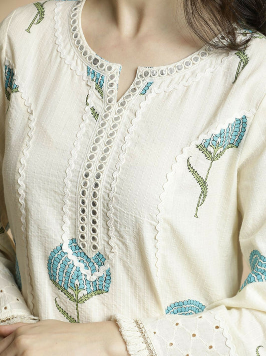 Off-White & Blue Floral Printed Notch Neck Kurta with Trouser