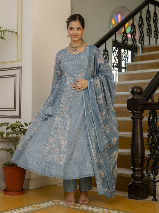 Grey Floral Anarkali Kurta Set with Printed Trousers & Dupatta