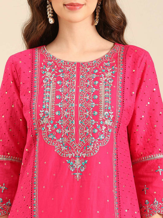 Pink Embroidered Round Neck Straight Kurta with Trouser & Dupatta