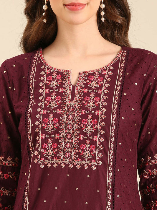 Maroon Floral Embroidered Cotton Kurta with Trousers & Dupatta