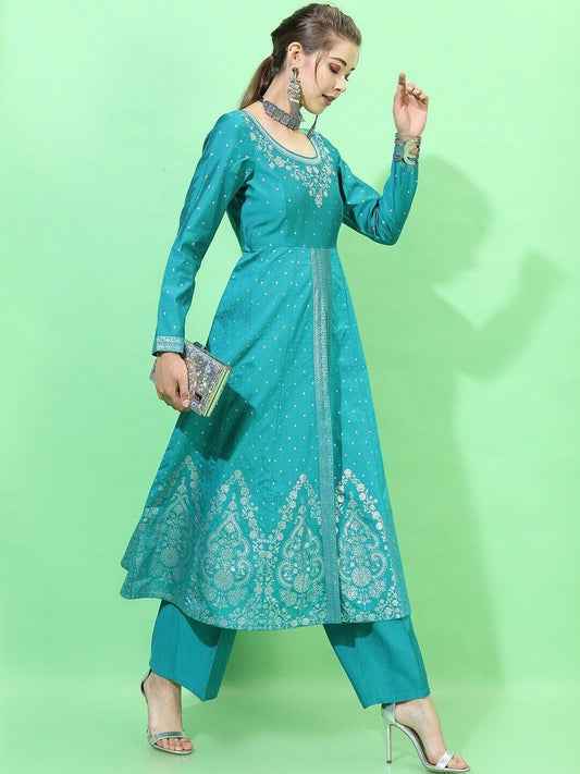 Teal Self Design Anarkali Kurti with Trousers | Elegant Indian Traditional Wear - Diwali Special