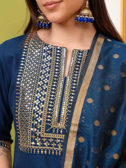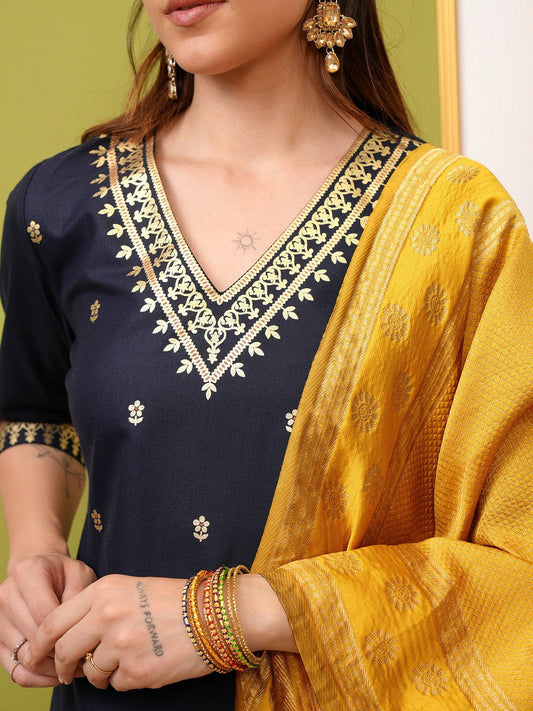Buy Women’s Navy Blue Ethnic Motifs Printed Kurta with Palazzos & Dupatta Set Online - Indiaista