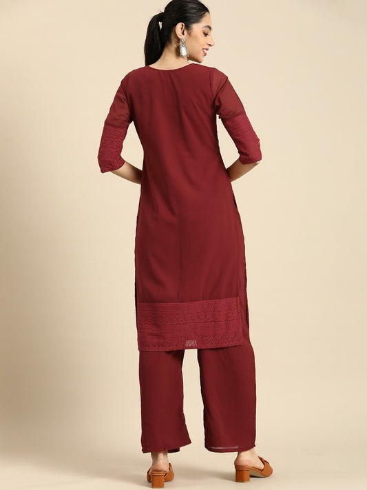 Maroon Chikankari Embroidered Kurta Set for Women – Ethnic Motifs, Palazzo Pants | Indiaista