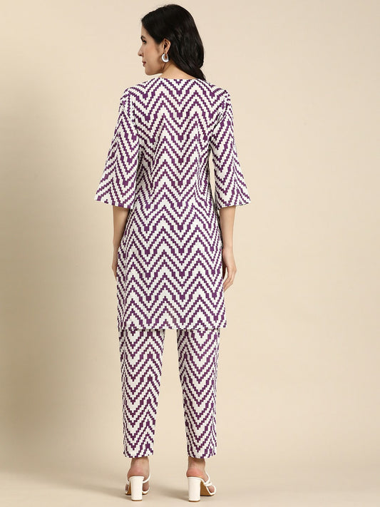 White & Purple Printed Cotton Kurta Set for Women – Straight Fit Kurta with Trousers | Indiaista