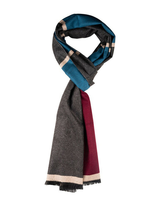 Men’s Colourblocked Woolen Scarf with Frayed Border – Maroon, Blue & Grey | Indiaista