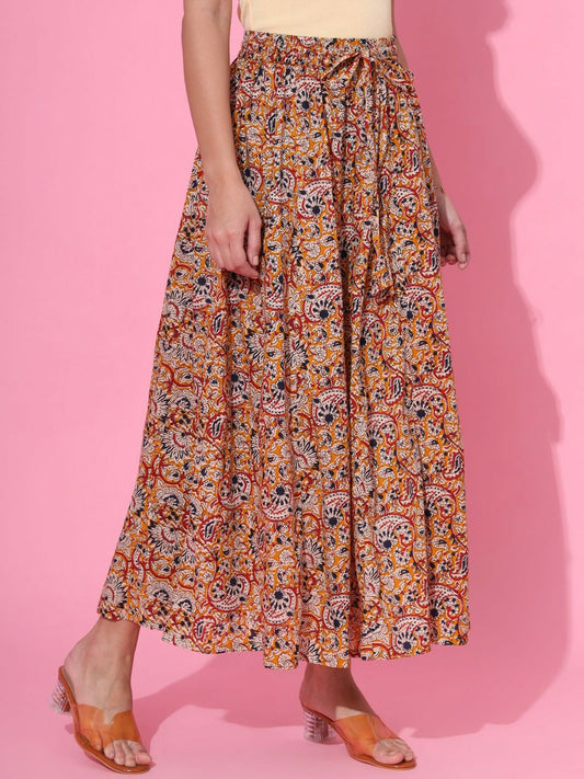 Mustard Yellow Boho Flared Maxi Skirt for Women | Vintage Bohemian Style with Tie-Up Waist