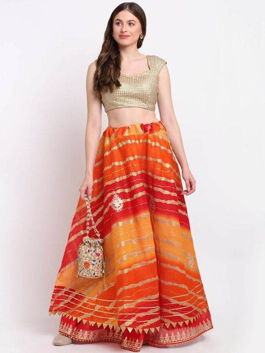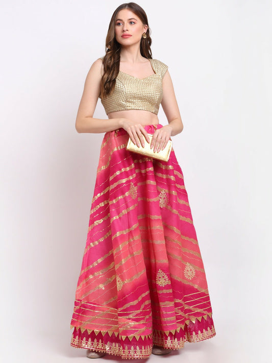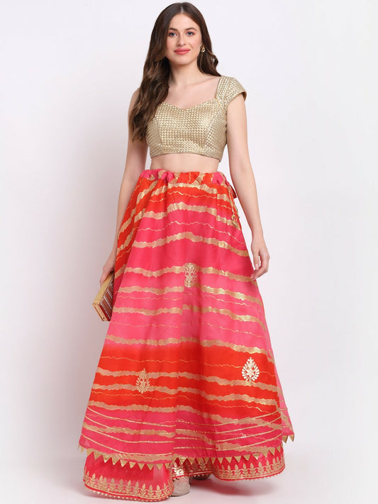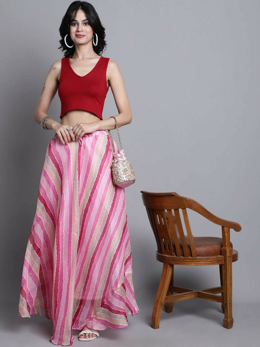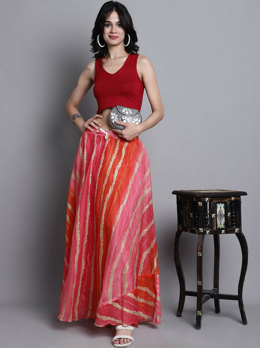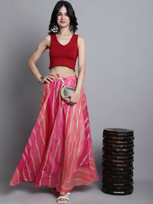Pink & Red Bohemian Maxi Skirt for Women | Gota Patti Work Flared Skirt with Elastic Waistband
