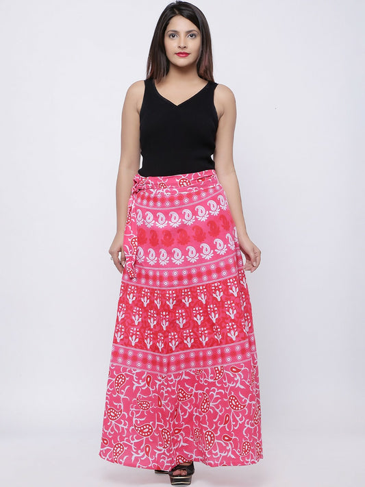 Pink & White Ethnic Print Wrap-Around Maxi Skirt | Boho Cotton Skirt for Women
