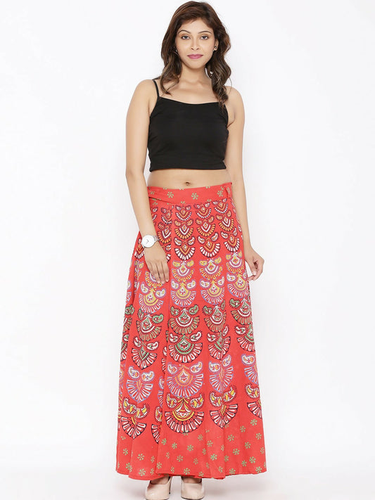 Coral Orange Ethnic Print Wrap-Around Boho Maxi Skirt for Women | Vintage Bohemian Style