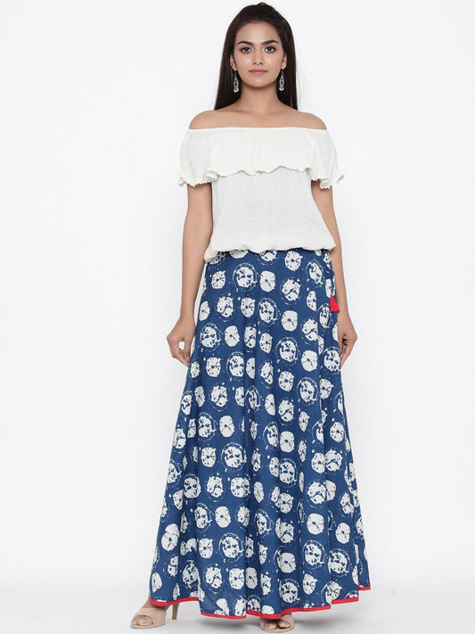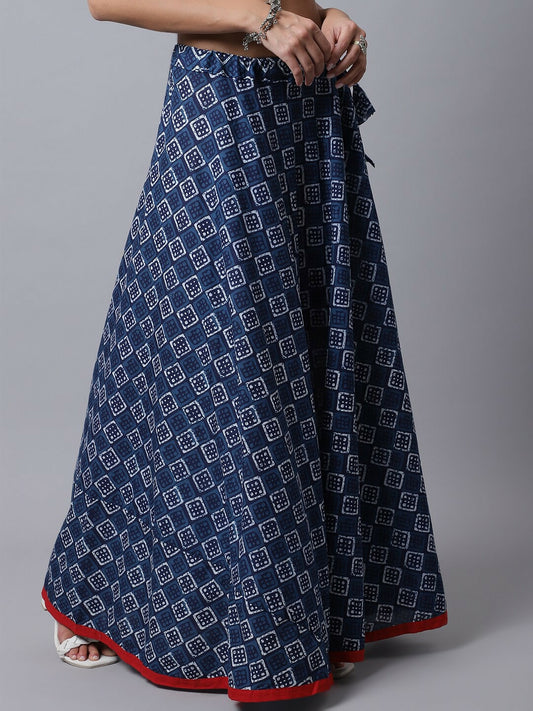 Navy Blue Bohemian Flared Skirt for Women | Vintage Boho Printed Cotton Skirt with Drawstring Closure
