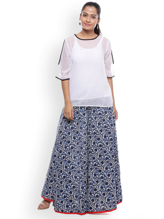 Blue Floral Print Boho Maxi Skirt for Women | Vintage-Inspired Flared Cotton Skirt with Tie-Up Waistband