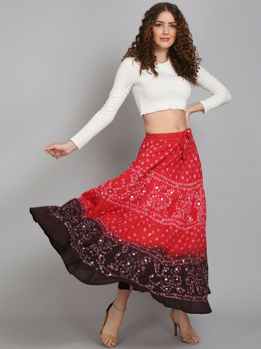 Red & Black Boho Bandhej Cotton Maxi Skirt for Women | Flared Tie-Dye Skirt with Elasticated Waist