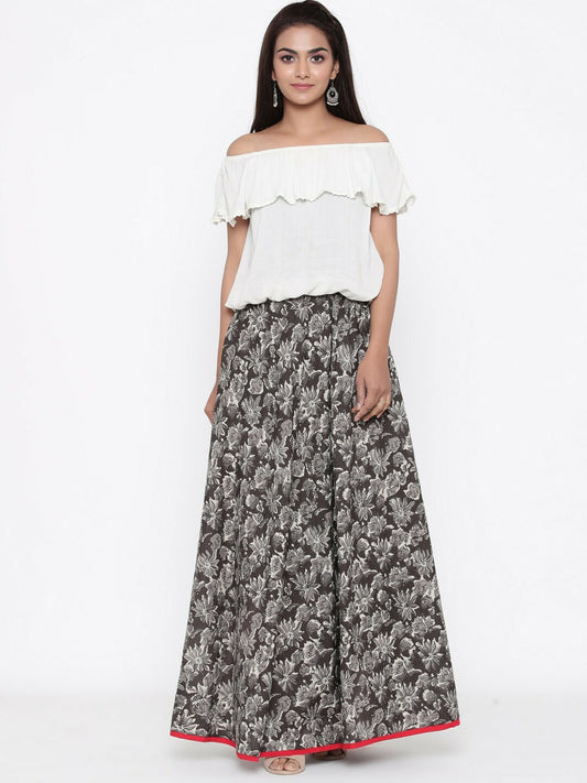 Vintage Bohemian Grey Printed Maxi Skirt for Women | Flared Boho Style with Floral Print
