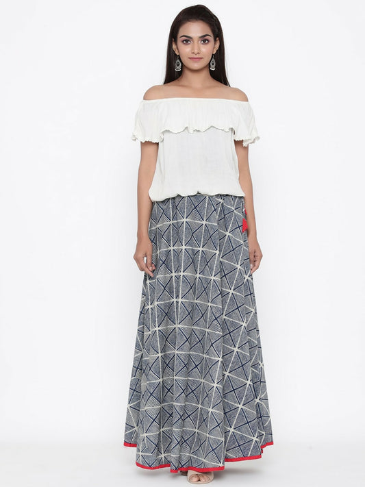 Vintage Bohemian Grey & White Indigo Printed Maxi Wrap Skirt for Women | Boho Style with Flared Hem