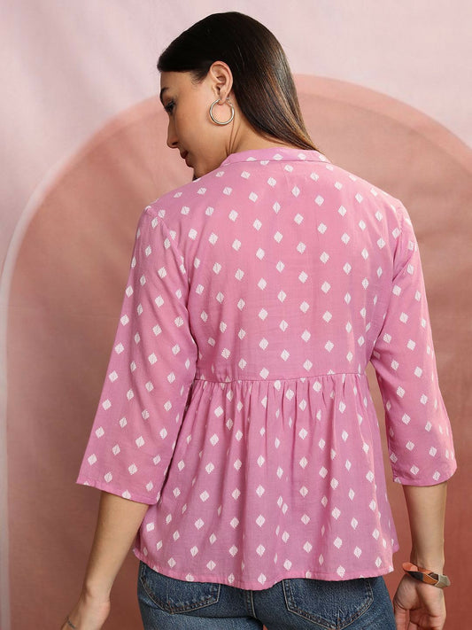 Pink & White Geometric Peplum Top for Women – Cotton, Mandarin Collar, Elegant Casual Wear | Indiaista