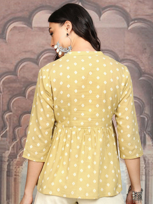 Yellow & White Geometric Peplum Top for Women – Cotton, Mandarin Collar, 3/4 Sleeves | Indiaista