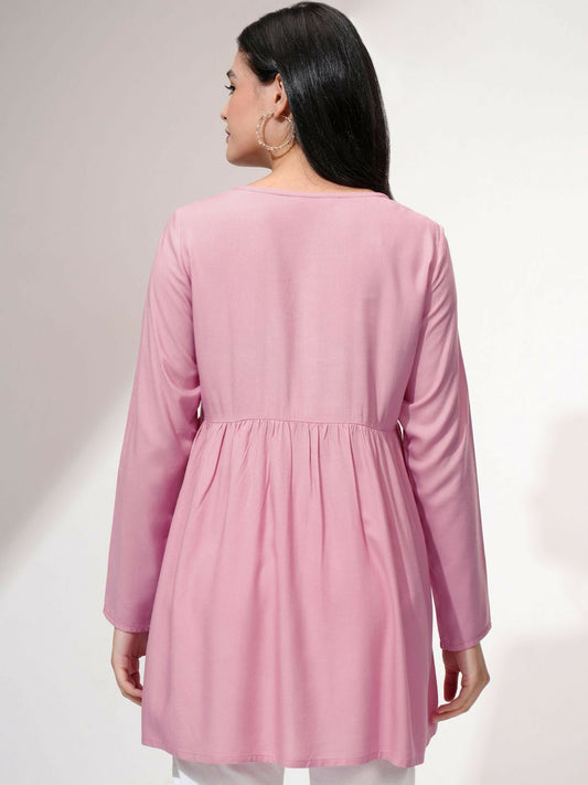 Pink Embroidered A-Line Top for Women – Round Neck, Long Sleeves, Stylish Casual Wear | Indiaista