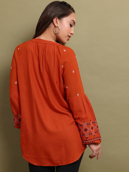 Rust & Black Ethnic Embroidered Tunic for Women – Round Neck, Puff Sleeves | Indiaista