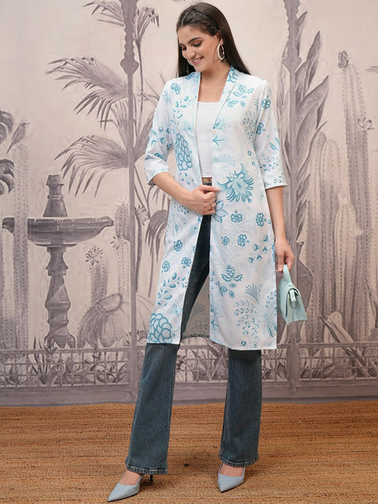 Buy Women’s Longline Padded Jacket – Stylish Blue Graphic Print with Faux Fur | Indiaista