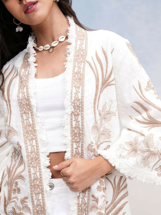 Buy Women Open Front Embroidered Kimono Jacket – Off White | Indiaista