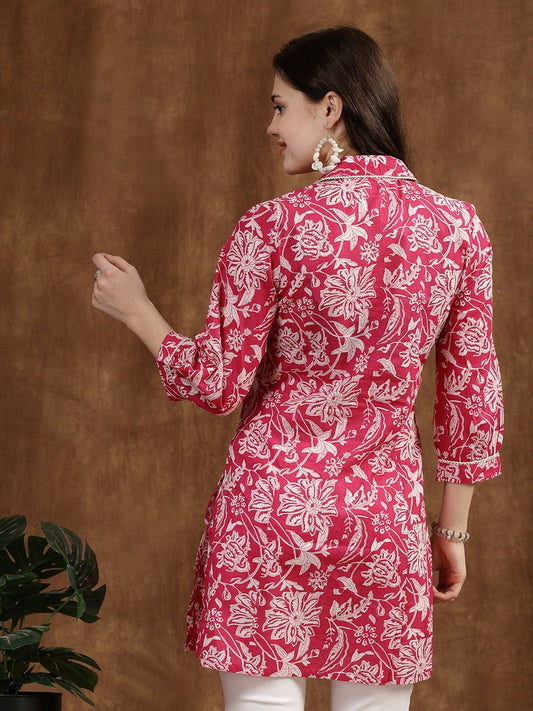 Fuchsia & White Floral Printed Cotton Tunic for Women – Embroidered, Shirt Collar, 3/4 Sleeves | Indiaista