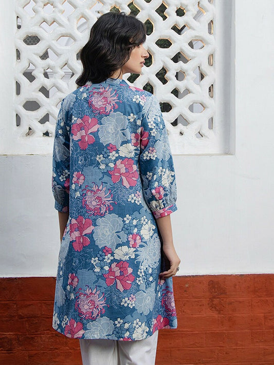 Women's Floral Printed A-Line Tunic – Blue, Pink & White | Pure Cotton, Mandarin Collar | Indiaista
