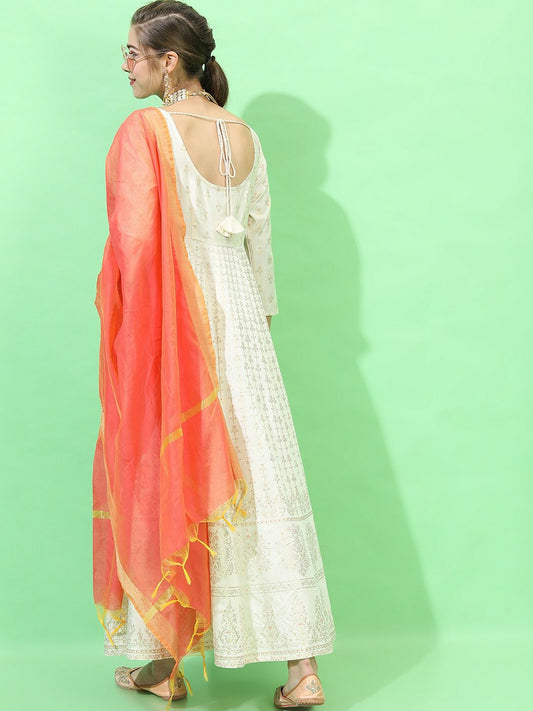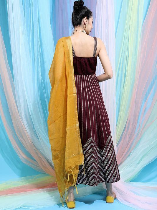 Buy Maroon & White Embellished Fit & Flare Maxi Dress with Dupatta – Indiaista