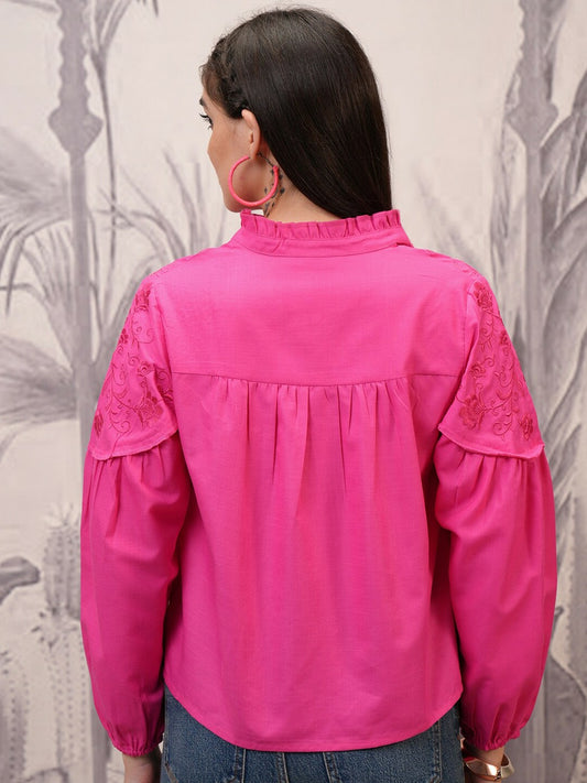 Magenta Shirt Style Top for Women – Mandarin Collar, Long Sleeves, Button-Down | Indiaista