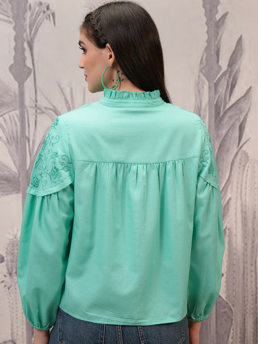 Turquoise Blue Mandarin Collar Puff Sleeve Shirt-Style Top for Women | Indiaista