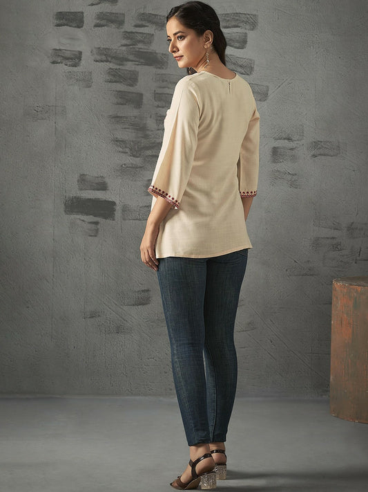 Beige Floral Embroidered A-Line Tunic for Women – Soft Liva Fabric, Round Neck | Indiaista