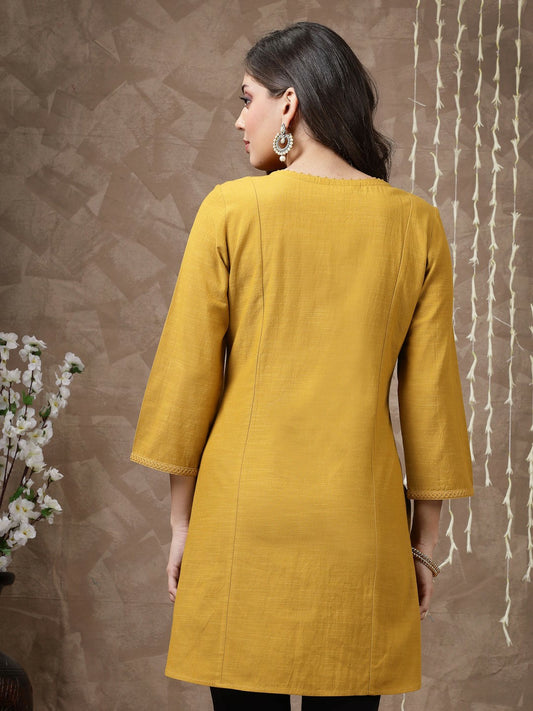 Mustard Embroidered Cotton Tunic for Women – Round Neck, 3/4 Sleeves, Casual & Ethnic Wear | Indiaista