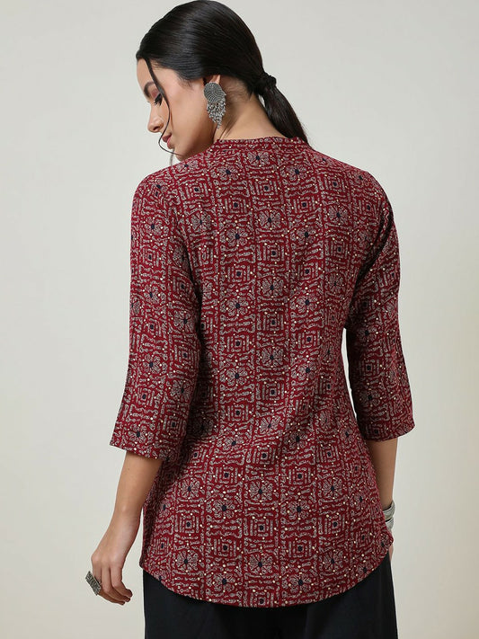Maroon & White Printed Tunic for Women – Mandarin Collar, 3/4 Sleeves | Indiaista