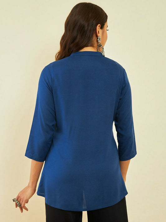 Teal & White Embroidered Tunic for Women – Mandarin Collar, 3/4 Sleeves, Button Closure | Indiaista