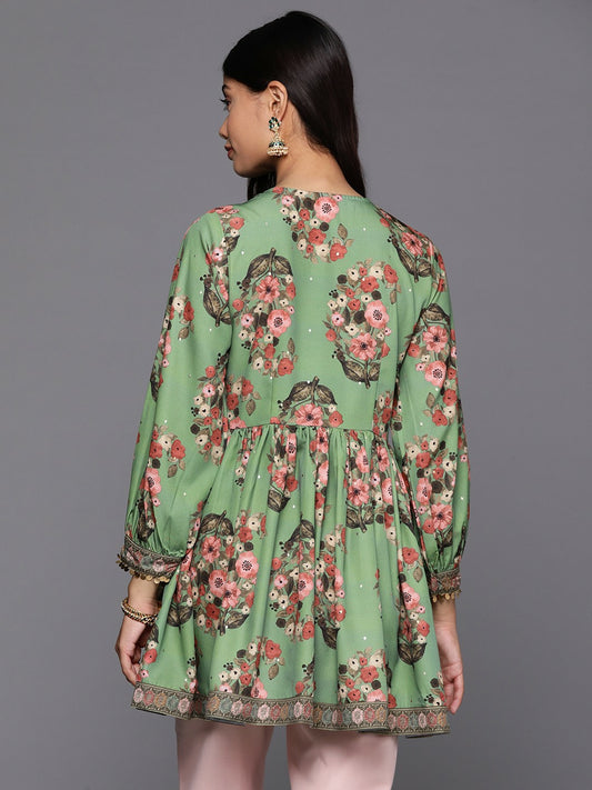 Green & Pink Floral Printed Tunic for Women – V-Neck, Long Sleeves, Stylish Ethnic Wear | Indiaista