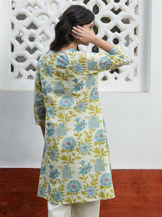 Off-White, Blue & Green Floral Printed Cotton Tunic for Women – A-Line, Mandarin Collar | Indiaista