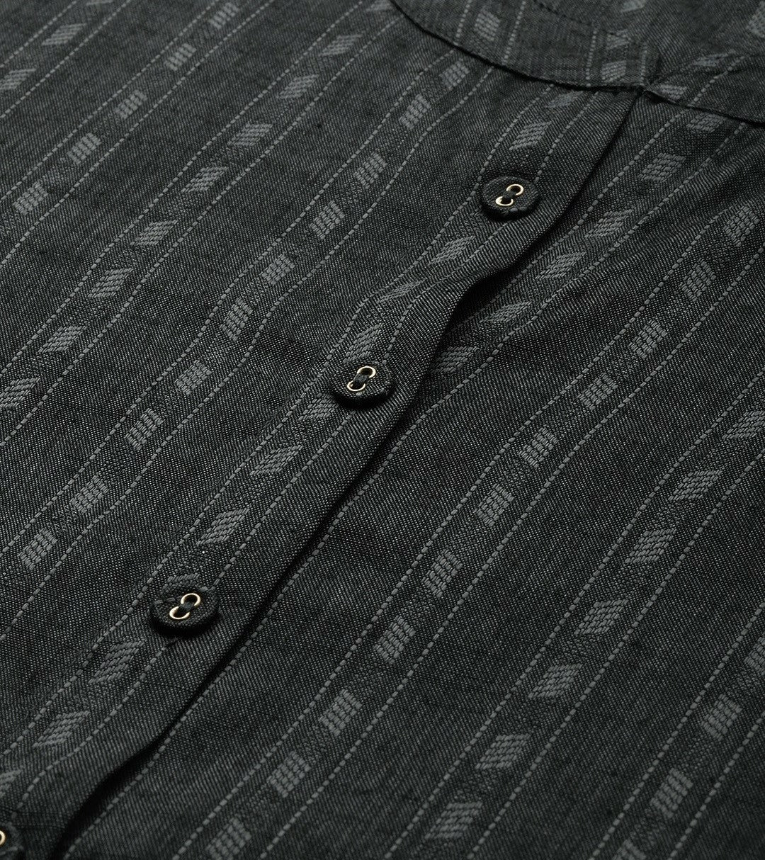 Elevate your ethnic style with this elegant black kurta featuring intricate geometric woven patterns. Designed in a straight silhouette with a mandarin collar and three-quarter sleeves, it offers a refined yet versatile look. Crafted from soft poly-viscose fabric, it ensures comfort and style for daily wear or festive gatherings. The knee-length cut with a straight hemline makes it easy to pair with trousers or palazzos. A timeless piece that blends modern charm with traditional aesthetics.