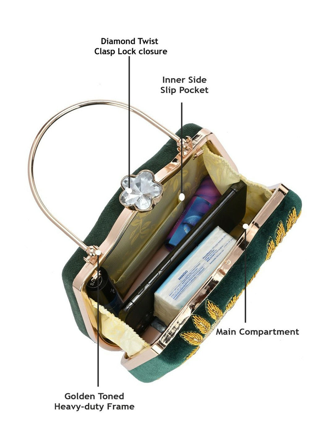 This vibrant box clutch dazzles in green and yellow embellishments with a sleek box silhouette. It features a chic shoulder strap, dual compartments secured by twist closures. Compact yet functional, it’s easy to clean—just wipe with a soft, clean cloth.