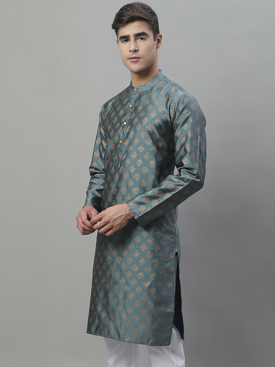 Add timeless elegance to your wardrobe with this grey kurta featuring a classic woven design. Tailored in a straight silhouette with a mandarin collar and full sleeves, this knee-length kurta is crafted from a luxurious silk-cotton jacquard blend for a refined finish and comfortable wear. Perfect for festive gatherings or semi-formal occasions.