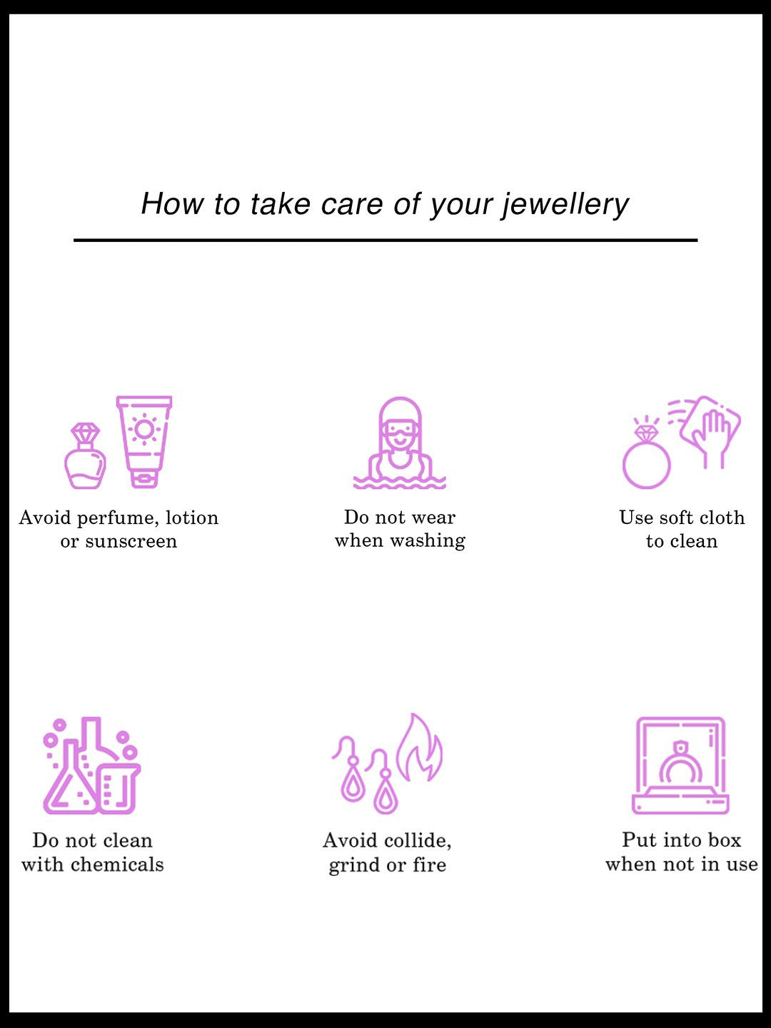 Wipe your jewellery with a soft cloth after every use Always store your jewellery in a flat box to avoid accidental scratches